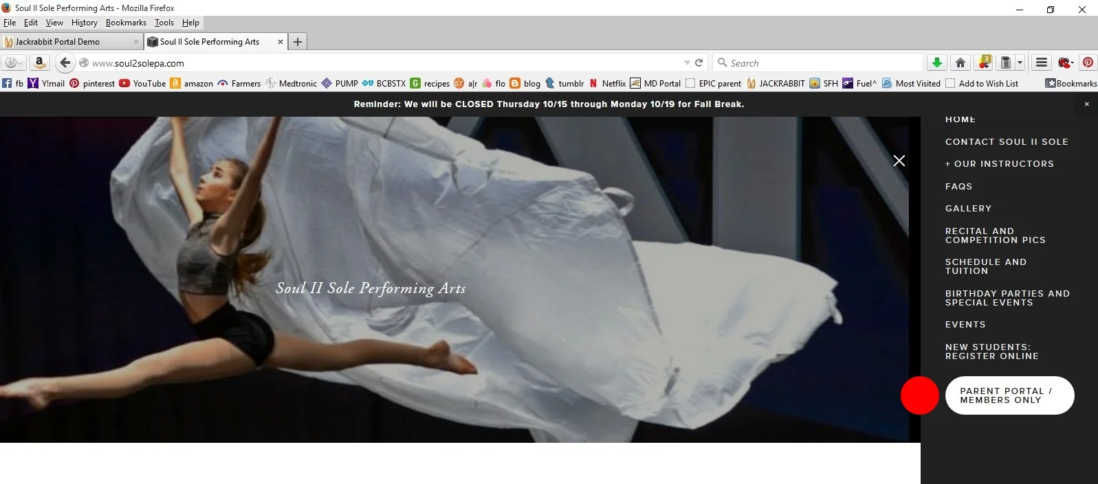 The Parent/Member Portal is an important tool for both families and Soul II Sole staff. This tutorial will walk you through various features and serve as a step-by-step “How-To” for families. Every family enrolled in our system has access. The images from the Portal featured in this tutorial are from a sample account. If you are unfamiliar with the features of the Portal, please take a moment to review this tutorial – it should answer most, if not all, of your questions. Watch the images for a red dot to ensure you understand each step.